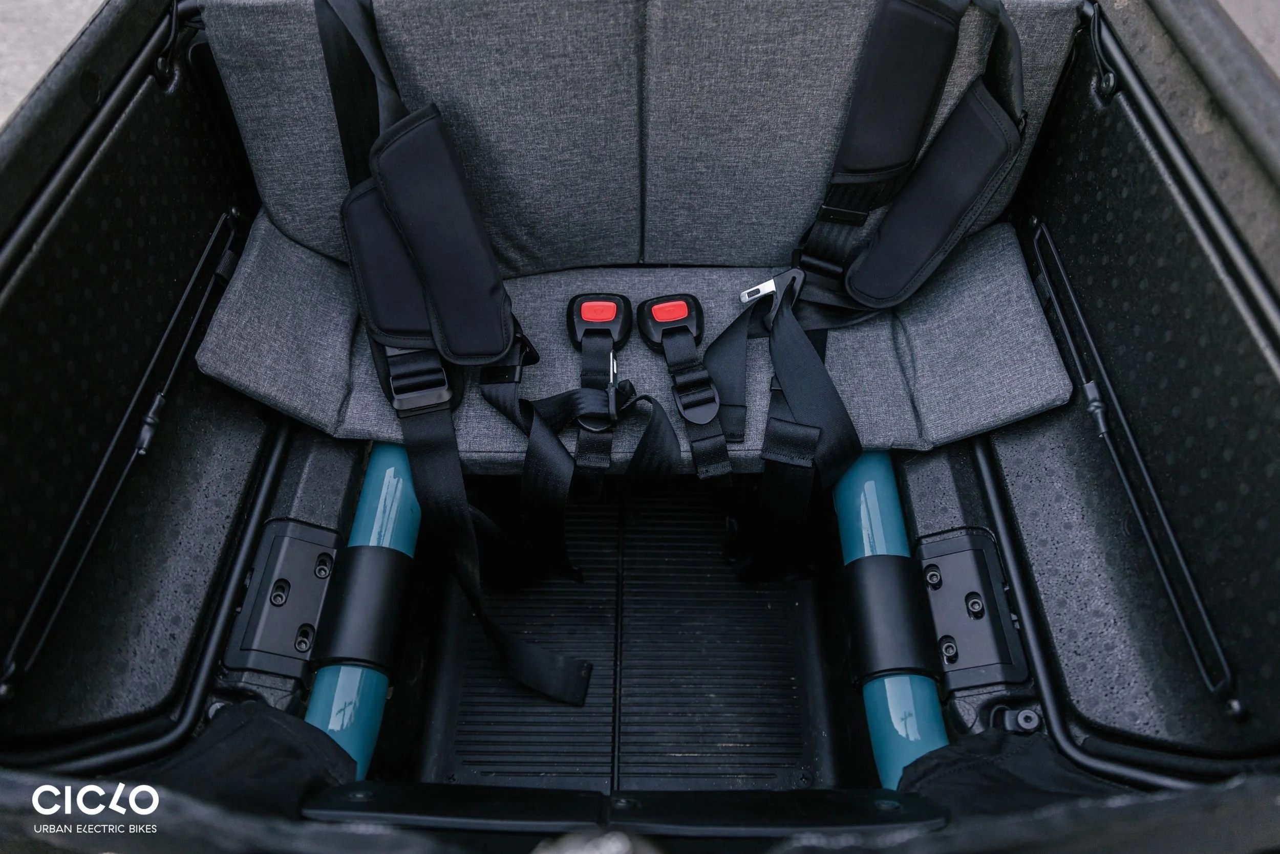 The headrest offers additional safety, especially when transporting taller children. A sturdy bench seat that can be suspended in the Flex Box in two different ways serves as a child seat. Depending on its position, it will accommodate either one taller or two smaller children age seven or younger – reliably protected by the five-point seat belts. And the comfortable back cushion automatically folds in when the Flex Box is closed. However, when the headrest is fitted, it cannot be closed. Please observe national regulations for the transport of children on bikes before using.