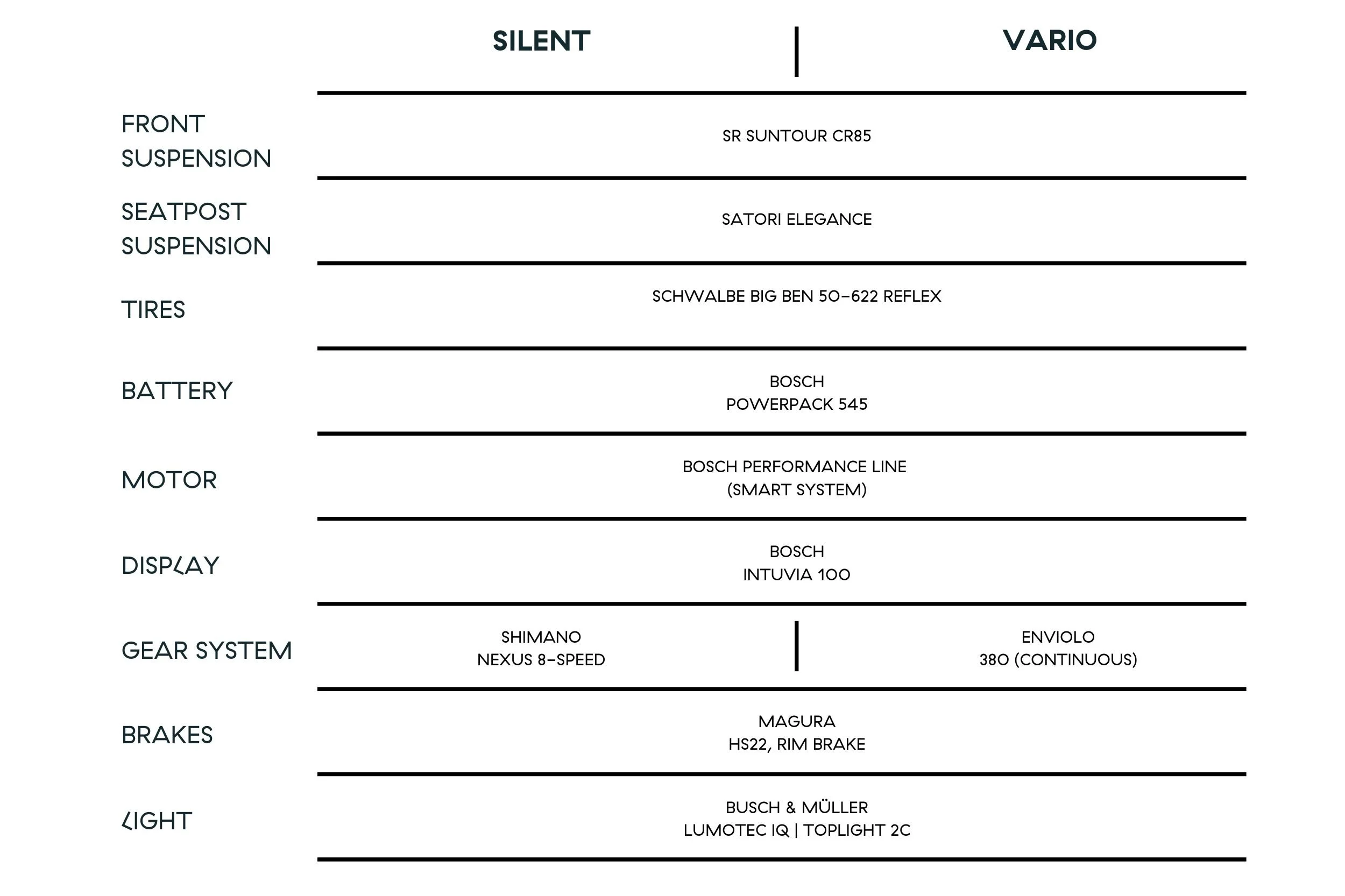 Vario: Has an Enviolo 380 continuous gear system (internal gear hub) and a Gates’ carbon belt drive.